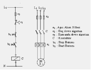 Start (başlatma) butonuna basılınca kontaktör enerjilenerek güç devresindeki normalde açık bulunan kontaklarını kapatır. Böylece şebeke gerilimi kontaklar ve sigorta üstünden motora tatbik edildiğinden motor çalışır. Elimizi start butonunudan çektiğimiz zaman buton kontakları açılır kontaktör bobini enerjisini keser. Kontaktörün enerjisi kesilince güç devresi üstünde bulunan kontakları açarak ve motoru durur. Motor kumanda devresi kurulumunda şebeke fazından, sigorta kontağının girişine, sigorta kontağı çıkışından aşırı akım rölesi kapalı kontağının girişine, kapalı kontağın çıkışından stop butonu girişine, stop buton çıkışından, start butonu girişine, start butonu çıkışından kontaktör bobin girişine bağlanır. Kontaktör bobin çıkışından da nötre bağlanarak kumanda devresi kurulmuş olur.