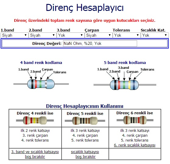 Aşağıdaki tabloda ise renklerin rakamsal karşılıkları verilmiştir. Dirençlerde tolerans değeri olarak kullanılan renk kodları o direncin hassasiyetini verir. Örneğin tolerans değeri olarak gümüş rengi kullanılmış ise o direnç +/- %10 toleransa sahiptir ve üzerine kodlanan değerin %10 üzeri veya %10 altında olabilir demektir. Tolerans renginden hemen önce gelen renk kodu ise çarpan değerini verir. Bu değer kendisinden önce gelen sayı renk kodlarının çarpılacağı değeri verir. Çarpan renk kodundan önce gelen bütün renk kodları ise sayı değeridir. Bu renklerin karşılık geldiği rakamlar yan yana konur ve çarpan rengi ile çarpılarak direncin değeri bulunur.