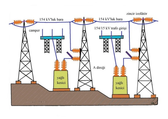 Açık yer tipi transformatörler 150-250 MVA gücündedir. Bu merkezlerdeki 154 kV’a düşürülen enerji belli bölgelere kadar iletim yapılarak YG/OG indirici merkezlerindeki yıldız-yıldız ve yıldız-üçgen bağlı 154/34,5kV,154/10,5kV trafolar kullanılarak gerilim OG seviyesine düşürülür.